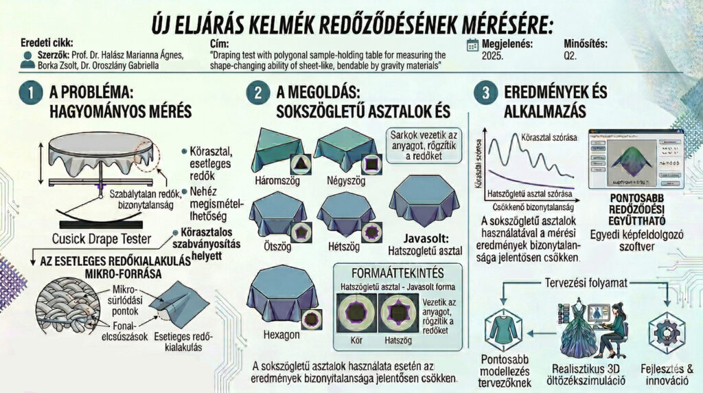 A textíliák egyik legfontosabb esztétikai és funkcionális jellemzője a redőződőképesség (draping), amely azt a bonyolult, háromdimenziós alakváltozást írja le, amint az anyag a gravitáció hatására egy tárgy formájához idomul. Legyen szó egy ruhadarab eséséről vagy egy függöny tartásáról, ez a tulajdonság határozza meg a késztermék végső karakterét és viselkedését. Az Óbudai Egyetem kutatása egy olyan innovatív eljárást mutat be, amely a látszólagos bizonytalanságból rendet teremtve teszi pontosabbá e komplex jelenség mérését.