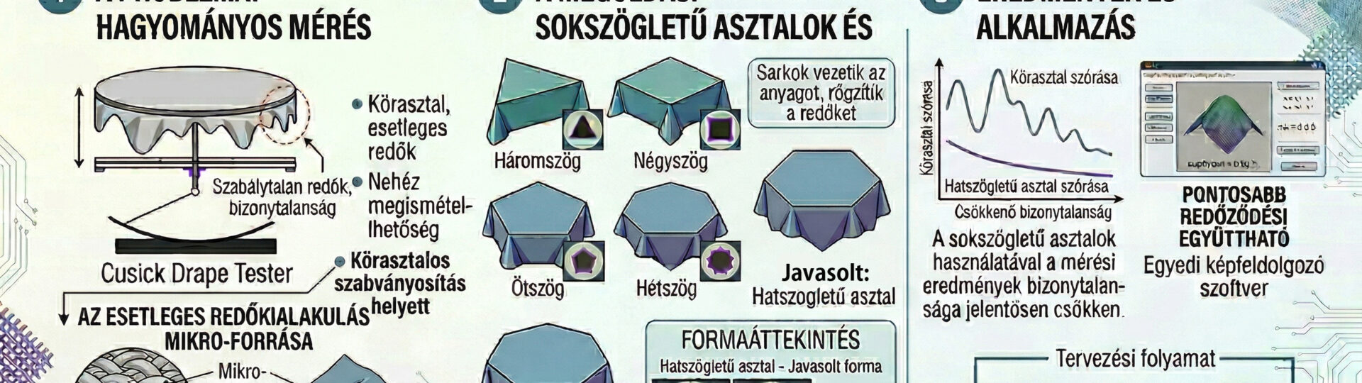 Draping test with polygonal sample-holding table for measuring the shape-changing ability of sheet-like, bendable by gravity materials Prof. Dr. Halász Marianna Ágnes, Borka Zsolt, Dr. Oroszlány Gabriella https://link.springer.com/article/10.1007/s42452-025-07014-0 A textíliák egyik legfontosabb esztétikai és funkcionális jellemzője a redőződőképesség (draping), amely azt a bonyolult, háromdimenziós alakváltozást írja le, amint az anyag a gravitáció hatására egy tárgy … Bővebben: Új módszer a textíliák redőződőképességének mérésére